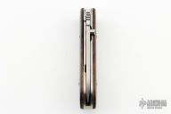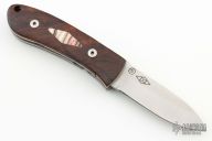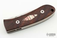 This DK-FHM linerlock folder by Dozier Knives has a satin finished D2 stainless steel drop point D2 blade with notched thumbrest and single thumbstud. The handle has ironwood scales with mammoth tooth inlays, titanium liners and a titanium backspacer.  Includes a zippered case. Excellent condition.