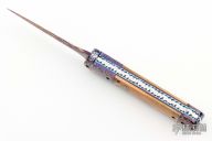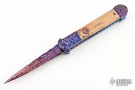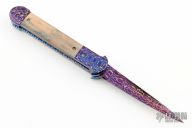 This Mini C-Lance automatic by Rainy Vallotton features a Chad Nichols "Cheetah" pattern Damascus blade, bolsters, and release button along with mammoth ivory scales. Dagger-style blade with a false top edge. File work on liners and backspacer. Strong and fast opening.  There is strong lock stick. Excellent condition. Comes with a zippered case.