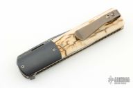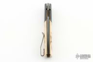 This Urban Barlow Flipper by Brad Zinker features a Vegas Forge "Virus" Damascus blade with checkered thumbrest and flipper. The handle has dovetailed Zirconium bolsters, mammoth ivory scales, anodized titanium liners with laser engraved interiors and a tip up anodized titanium clip. Rides on bearings, nice detent, lockup and blade seating. Comes with zippered case. Excellent condition.