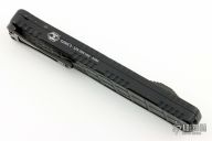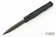 This Cleric II OTF by Heretic Knives features a hand ground DLC Vegas Forge Reptilian Damascus double edged  blade. The handle has a black aluminum frame with crocodile inlays, DLC titanium tip down clip. S/N 049. Comes with original box, a zippered case. Has some scuffs, has been lightly carried, otherwise excellent condition.