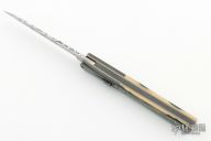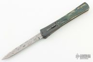This Slim Auto by Chuck Gedraitis features a Damasteel blade with false top edge. The handle has zirconium bolsters, Damascus rocker bar, mammoth ivory scales, orange peel finished and anodized titanium liners with filework, zirconium backspacer. Nice action, lockup and blade seating. Comes with a zippered case and COA. Excellent condition.