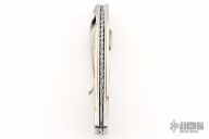 This knife by Charles Kain features a Damascus blade with fileworked spine. The handle has a stainless steel frame with mammoth ivory inlays, fileworked stainless steel backspacer, mammoth ivory inlaid push button. Comes with a zippered case. Has a few light scratches, otherwise excellent condition.