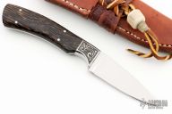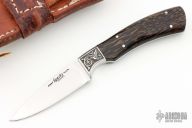 This hunter by Bernard Sparks features a mirror polished drop point blade, .117" blade stock and .886" blade depth, full tapered tang construction. The handle has engraved stainless steel bolsters, black palmwood scales.  Includes a brown leather sheath. Excellent condition.