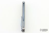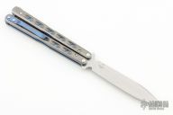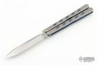 This Model 51 Morpho Balisong has a tumble finished D2 stainless steel spear point blade. Handle has tumbled titanium scales by Flytanium with blue jeweled/ anodized titanium liners and blue anodized titanium tip up clip. Comes with drawstring pouch, original box and papers. Has a couple light scratches, otherwise excellent condition.