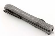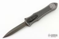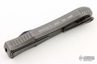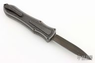 This knife is a Deadlock Model C by Grant and Gavin Hawk. It has a double-edged DLC blade. The handle has carbon fiber inlays in the stonewashed titanium frame with a tip down spring clip, titanium. The thumb slide on the handle is also titanium and the handle has a titanium overlay. DLC titanium clip and thumbslide. Comes with a cloth pouch. Grant and Gavin Hawk set out to create a double action OTF with no blade play.... They did it, NO blade play. Comes with cloth pouch. Slight mark on the blade DLC, otherwise excellent condition.