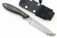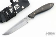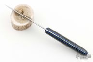 This neck knife by Murray Carter features a hand forged San Mai drop point blade with a tappered tang construction. .124" Blade Stock. .910" Blade Depth. The handle has carbon fiber scales over blue/black G-10 liners. This knife includes a kydex neck sheath.  Excellent Condition.
