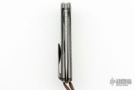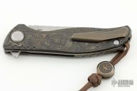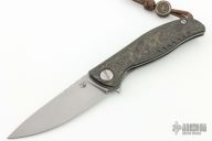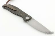 This F3 Flipper from Shirogorov has a tumbled flat ground spear point blade with notched flipper. Handle has Rare Earth Techno carbon fiber scales, tumbled titanium backspacer, tip up clip and liners. Recessed lanyard bail. Dead center blade seating, excellent detent and lockup. Rides on bearings. Excellent condition. Comes with original box and papers.
