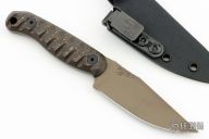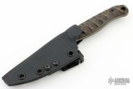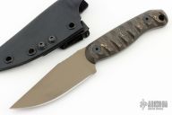 This Featherlite by Half Face Blades features a tan cerekote blade with a notched thumbrest, .114" blade stock, 1.153" blade depth, full tang construction.  The handle has black/gold layered scales.  Comes with a kydex sheath with clip. Has some light scuffs otherwise excellent Condition.