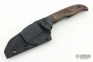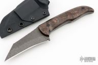 This fixed blade by Half Face Blades features an acid tumble finished blade with a textured blade spine, .154" blade stock and 1.418" blade depth, full tang construction.  The handle has copper carbon fiber scales and black pins. Comes with a kydex sheath. Excellent condition.