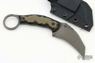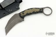 This Karambit by Half Face Blades features a dark tumble finished chisel ground hawkbill blade with textured spine, .157" blade stock and 1.398" blade depth, full tang construction. The handle has black and tan g10 scales with a ring at the butt. Comes with kydex sheath with belt clip. Excellent condition.