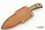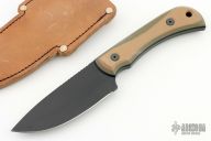 This Cav by Half Face Blades features a black coated blade with a notched thumbrest, .150" blade stock, 1.485" blade depth, full tang construction.  The handle has tan/black G-10 scales.  Comes with a leather belt sheath set up for horizontal or vertical carry. Excellent condition.