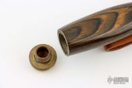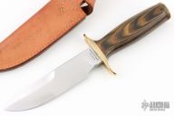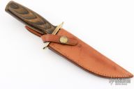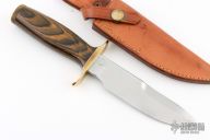 This knife by Smith and Wesson features a matte finished spear point blade with sharpened top edge, .243" blade stock and 1.281" blade depth, hidden tang construction. The handle has a brass guard, hollow wood handle and a knurled brass butt cap that is removable. Has a couple light scuffs, has been resharpened, otherwise good condition. Made in the 70's. #37049. Comes with original sheath.
