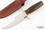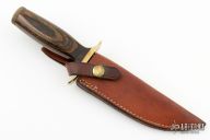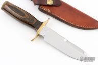 This knife by Smith and Wesson features a mirror finished spear point blade with sharpened top edge, .233" blade stock and 1.273" blade depth, hidden tang construction. The handle has a brass guard, hollow wood handle and a knurled brass butt cap that is removable. Has a couple light scratches, otherwise excellent condition. Made in the 70's. #35856. Comes with original sheath.