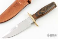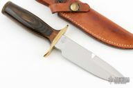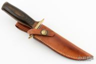 This knife by Smith and Wesson features a mirror finished spear point blade with sharpened top edge, .233" blade stock and 1.273" blade depth, hidden tang construction. The handle has a brass guard, hollow wood handle and a knurled brass butt cap that is removable. Has scratches, otherwise good condition. Made in the 70's. #3833. Comes with original sheath.