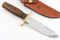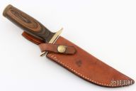 This knife by Smith and Wesson features a mirror finished spear point blade with sharpened top edge, .233" blade stock and 1.273" blade depth, hidden tang construction. The handle has a brass guard, hollow wood handle and a knurled brass butt cap that is removable. Has some scratches, has been resharpened, otherwise good condition. Made in the 70's. #32654. Comes with original sheath.