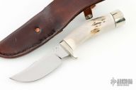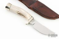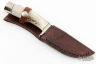 This hunter from G. Anderson features a satin finish upswept blade with swedge and notched thumbrest, .113" blade stock and 1.077" blade depth, hidden tang construction. The handle is comprised of a nickel silver guard and butt, stag grip and black/white spacers. Includes leather sheath with belt loop. Has a couple light scratches, otherwise excellent condition.