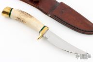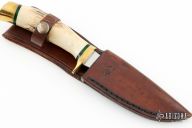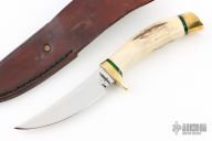 This hunter from G. Anderson features a mirror finished blade with .166" blade stock and .850" blade depth, hidden tang construction. The handle has a brass guard and butt, stag grip and black spacers. Includes leather sheath with belt loop. Excellent condition.