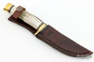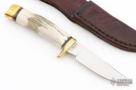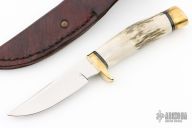 This hunter from G. Anderson features a mirror finished blade with .120" blade stock and .825" blade depth, hidden tang construction. The handle has a brass guard and butt, stag grip and black/grey spacers. Includes leather sheath with belt loop. Excellent condition.