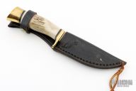 This hunter from G. Anderson features a satin finish upswept blade with swedge, .136" blade stock and .963" blade depth, hidden tang construction. The handle is comprised of a brass guard and butt, stag grip and black/grey spacers. Includes leather sheath with belt loop. Has a couple light scratches, otherwise excellent condition.