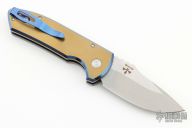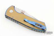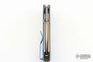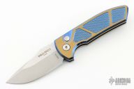 This collaboration between Protech and Les George features a two-tone blade with notched thumbrest. The handle has a two-tone titanium frame with a stainless steel tip up clip, has a pearl inlay in the push button. Comes with original box and papers. #006. Excellent condition.