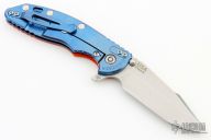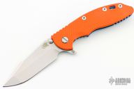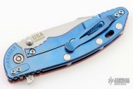 This XM-18 Skinny by Rick Hinderer features a stonewash finished blade with notched thumbrest and flipper. The handle has an orange G-10 scale, blue stonewashed titanium frame, and a tip up or down reversible flamed titanium clip and copper filler tab, lanyard hole at the butt. Comes with original box and extra hardware. Has a couple light scuffs, otherwise excellent condition.