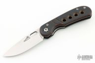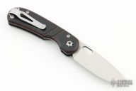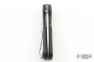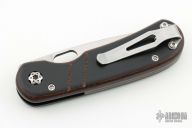 This Linerlock Front Flipper from Walter Wells of Wells Blade Works features a satin finished blade with notched front flipper and a thumbhole. The handle has brown burlap micarta scales with black G-10 overlay and black G-10 liners, inlaid/nested titanium liner, stainless tip down clip and hardware. The backspacer is comprised of laminated black/brown G-10. Some scuffs on the clip, otherwise excellent condition. Comes with COA dated 5/24/23