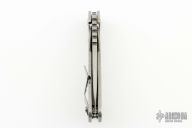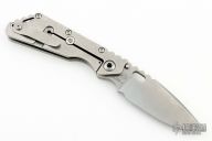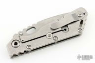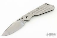 This Mick Strider Performance Series SMF framelock folder features a spear point blade with thumbhole and notched thumbrest. The handle has a stonewashed titanium frame with titanium clip, tip up carry. Jimping on blade spine. Includes Hinderer "Lock Bar Stabilizer" for maximum reverse lock retention. Nice detent, lockup and blade seating. New condition.