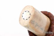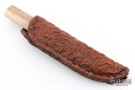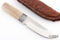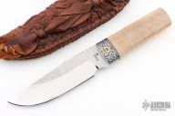 This knife features a mirror polished blade with fileworked spine and textured flats, .196" blade stock and 1.562" blade depth, hidden tang construction. The handle has engraved stainless steel bolsters with gold inlays done by Panteghini, and a fossil walrus ivory handle with gold lip pearl inlay in the butt. Comes with a hand tooled brown leather sheath and a COA dated 3/14/98. Has a crack in the pearl in the butt, has a small crack at the butt of the handle, otherwise excellent condition.