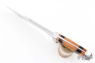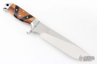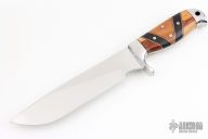 This knife by Riddle features a mirror polished blade with false top edge and notched thumbrest, .192" blade stock and 1.406" blade depth, full tapered tang construction. The handle has a stainless steel guard and rear bolsters, multi-piece wood scales. Has a few light scratches and spots on the blade, otherwise excellent condition.