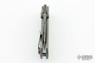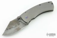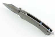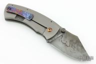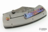 This FMUK by Jonathan McNees features a flat ground blade with dual thumbstuds, notched thumbrest and a hamon. The handle has a tumble finished titanium frame, dimpled pivot and a Timascus tip up pocket clip. Anodized carved titanium posts. Nice detent, blade seating and lockup. Comes with metal COA, and handkerchief. Has a couple light scuffs and scratches, great condition otherwise.