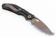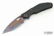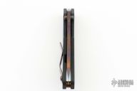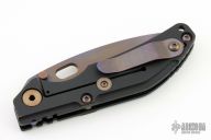 This DDC BBNM by Duane Dwyer features an SM-100 blade with thumbhole and heat treat colors. The handle has a milled titanium frame with DLC finish. Stonewash anodized titanium tip up clip that is left/right reversible, bronzed screws and pivot. Nice detent, lockup and blade seating. Comes with velcro case, original papers, and patch. Has a couple light scuffs, otherwise excellent condition.