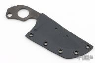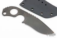 This SLCC fixed blade by Mick Strider features a black drop point recurve blade with a notched thumbrest, .151" blade stock and 1.494" blade depth. The handle has a finger groove and ring. Comes with a kydex sheath. Excellent condition.