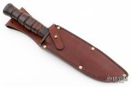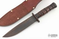 This knife by Barry Dawson features a black drop point blade with false top edge, .247" blade stock and 1.584" blade depth, hidden tang construction. The handle has a black steel guard with stacked leather handle and a black steel butt. Comes with a brown leather sheath. Excellent condition.