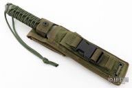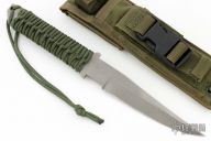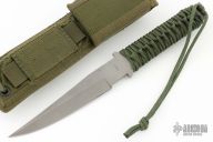 This Fighter by Strider features a bead blasted blade with a false top edge, .261" blade stock and 1.158" blade depth, full tang construction with a green paracord wrapped handle. Comes with a green S.O.E. sheath. Has a couple of light scratches, otherwise excellent condition.