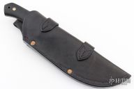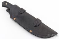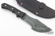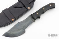 This is a WSK Tracker made by Dave Beck. It features a blued and hand rub satin finished blade with self-cleaning sawteeth on blade spine. Black linen micarta scales. Full tapered tang construction with .234" blade stock and 2.465" blade depth. Includes original Dave Beck black leather sheath. Tracker is stamped "645" on ricasso. Has a couple light scuffs, otherwise excellent condition.