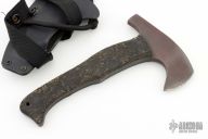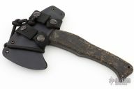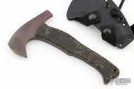 A small hand axe designed with hunters in mind, the WK Hunter Axe is effective for clearing a sight window, game prep and normal camping chores. This version is made of ⅜" stock. Axe Specifications Axe steel: 80CrV2 Black oxide no-glare finish Head length: 4 3/4" Overall length: 9" Blade thickness: 3/8", full tapered tang construction. Sheath Fast draw carrier Lined Kydex® HD shockcord quick-release retention system Nylon belt straps with Mil-Spec Pull-The-Dot™ snaps Designed for multiple carry options (See our Info page for carry options). This one has rubber scales. Has some scuffs and scratches, has been lightly used, otherwise good condition.