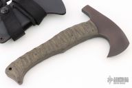 A small hand axe designed with hunters in mind, the WK Hunter Axe is effective for clearing a sight window, game prep and normal camping chores. This version is made of ⅜" stock. Axe Specifications Axe steel: 80CrV2 Black oxide no-glare finish Head length: 4 3/4" Overall length: 9" Blade thickness: 3/8", full tapered tang construction. Sheath Fast draw carrier Lined Kydex® HD shockcord quick-release retention system Nylon belt straps with Mil-Spec Pull-The-Dot™ snaps Designed for multiple carry options. This one has sculpted black canvas micarta scales. Excellent condition.