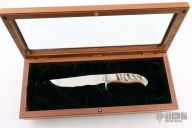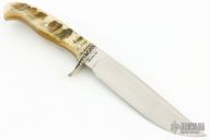 This Model 20 by Browning is #351/600 and was made and signed by Dan K Harrison. It features a hand rub satin finished blade with false top edge, .171" blade stock and 1.165" blade depth, full tang construction. The handle has an engraved nickel silver guard and sheep horn scales with nickel silver pins. Engraving done by Michael Collins. Comes with a wooden display box. Excellent condition.