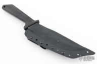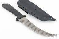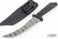 This Upswept Persian fighter by Mick Strider features a tiger striped multi-ground blade with a sharpened top edge, .274" blade stock and 1.275" blade depth, hidden tang construction. The handle has a two-piece G-10 grip with dovetailed seam. Comes with a kydex sheath. "026" on the ricasso. Has light sheath marks on the blade, otherwise excellent condition.