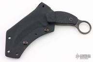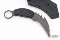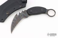 This MSC PS Karambit by Mick Strider features a flamed titanium blade with sharpened top edge, .145" blade stock and 1.246" blade depth, full tang construction. The handle has black G-10 scales, ring at the butt. Comes with kydex sheath. Has some scuffs on the blade, otherwise excellent condition.