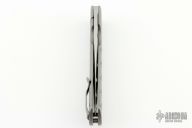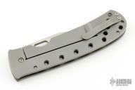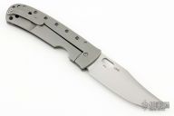 This XL Moran Bowie framelock folder by Tom Mayo features a clip point hand rub satin finished blade with thumbhole and false top edge. The handle has a bead blast titanium frame and tip up clip. Smooth action. Nice blade seating, detent and lockup. Comes with a zippered case. Has a few light scuffs, otherwise excellent condition. #003 on the blade as well as his 25th Anniversary logo.