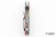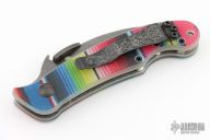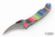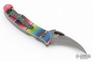 This Elvia by Emerson Knives features a thunderstorm finished hawkbill blade with a Damascus thumbdisc. The handle has Sarape G-10 scales, titanium liners and a black laser engraved stainless steel tip up clip. Comes with original box, clip and papers. Excellent condition. #0206.