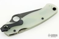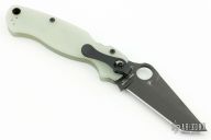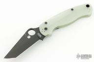 This G81GM4BKP2 Paramilitary 2 by Spyderco features a black tanto blade with thumb hole, notched thumb ramp and choil. The handle has a textured jade G10 scales over a stainless steel subframe and lockbar. 4 way adjustable pocket clip and lanyard tube in pommel. Includes original box and paperwork. Excellent condition.