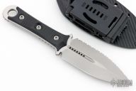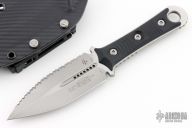 This SBD by Microtech Knives and Borka Blades features a stonewash finished double-edged blade with one fully serrated edge, .188" blade stock and 1.556" blade depth, full tang construction with black G-10 scales. Comes with the original kydex sheath, box and papers, dated 05/2021 s/n 1050. Excellent Condition.