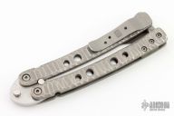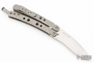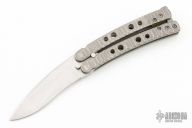This EDC Balisong by Mikkel Willumsen features a hand rub satin finished blade. The handle has sculpted and blasted titanium handles with jade G-10 spacers. Has some scratches, otherwise good condition. Comes with a zippered case.