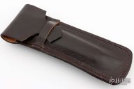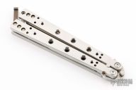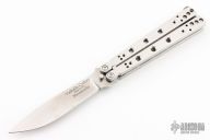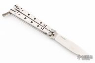 This balisong by Valhalla Cutlery features a satin finished blade. The handles are stainless steel with a T-latch. Has a couple light scratches, otherwise excellent condition. Comes with a leather sheath.