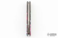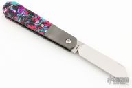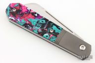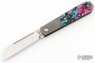 This Midnight Jack is a Barlow (Coffin) slipjoint model by Jack Wolf Knives featuring a belt satin finished sheepsfoot blade with longpull. The handle has integral bead blast finish pinched and fluted titanium front and rear bolsters and liners, Kaotic Resin scales with a stainless spring. Comes with box, metallic tube with J.Gonzo artwork, leather slip, sticker and microfiber cleaning cloth. New from Maker.