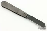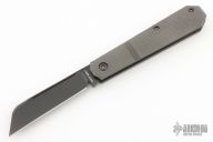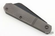 This Midnight Jack is a Barlow (Coffin) slipjoint model by Jack Wolf Knives featuring a DLC finished sheepsfoot blade with longpull. The handle has integral bead blast finish pinched and fluted titanium front and rear bolsters and liners, jigged titanium scales with a stainless spring. Comes with box, metallic tube with J.Gonzo artwork, leather slip, sticker and microfiber cleaning cloth. New from Maker.