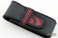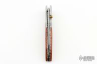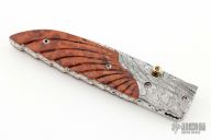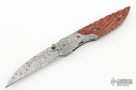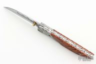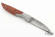 This knife by Appaloosa Knives features a Damascus blade with a single thumbstud with a stone inlay, carved blade. The handle has carved Damascus bolsters, carved rose wood scales, fileworked stainless steel liners and backspacer. Includes a leather sheath.  Blade is off center.  Excellent condition.