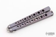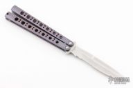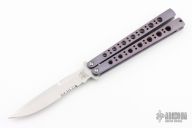 This Model 42AS Balisong features a tumble finished partially serrated blade and anodized and military finished (bead blasted) titanium handles. Missing T-latch. Includes a zippered case. Has a couple scratches, otherwise good condition.